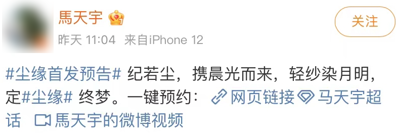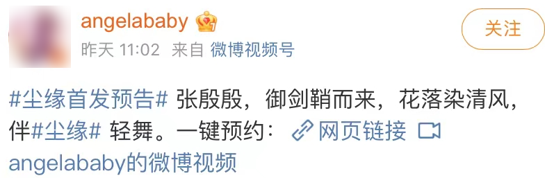 “Angelababy和马天宇官宣了!” Angelababy和马天宇主演新剧《尘缘》首发预告片曝光,两人文艺官宣,仙侠氛围感拉满。 一段高甜吻戏随之曝光!让人一秒沦陷。 两人的角色设定分别是酷飒师姐张殷殷(Angelababy饰)与嘴甜师弟纪若尘(马天宇饰)。 “Angelababy和马天宇官宣了!” Angelababy和马天宇主演新剧《尘缘》首发预告片曝光,两人文艺官宣,仙侠氛围感拉满。 一段高甜吻戏随之曝光!让人一秒沦陷。 两人的角色设定分别是酷飒师姐张殷殷(Angelababy饰)与嘴甜师弟纪若尘(马天宇饰)。 剧里Angelababy霸气表白马天宇: “以后啊,你就是我的人了” 顶配高颜值组合,配上飒气十足的台词,这姐弟CP氛围感立马就拿捏住了~  |