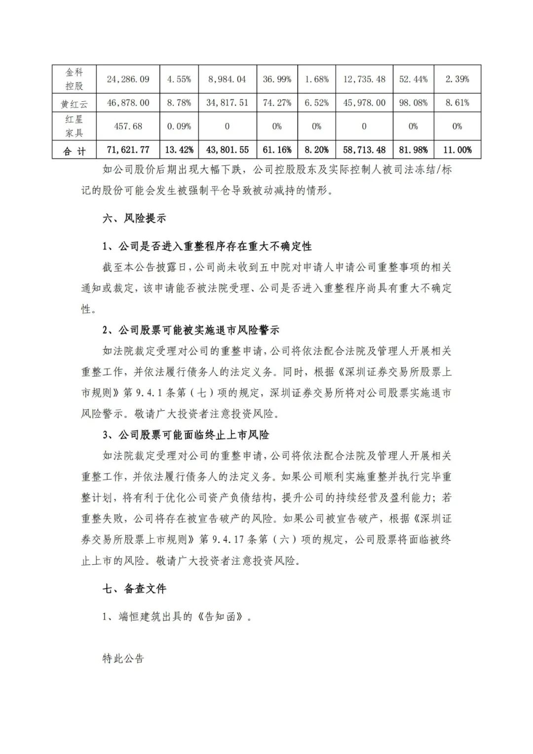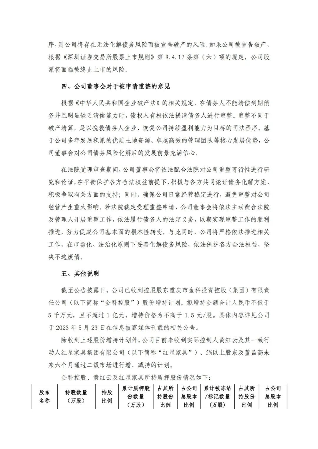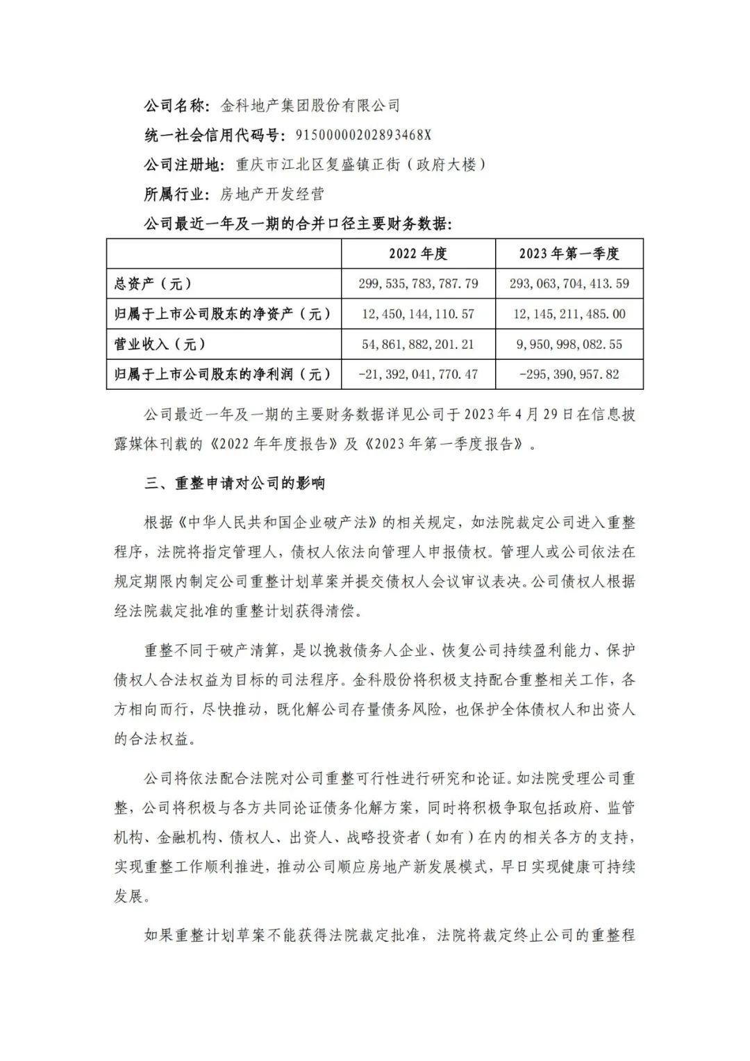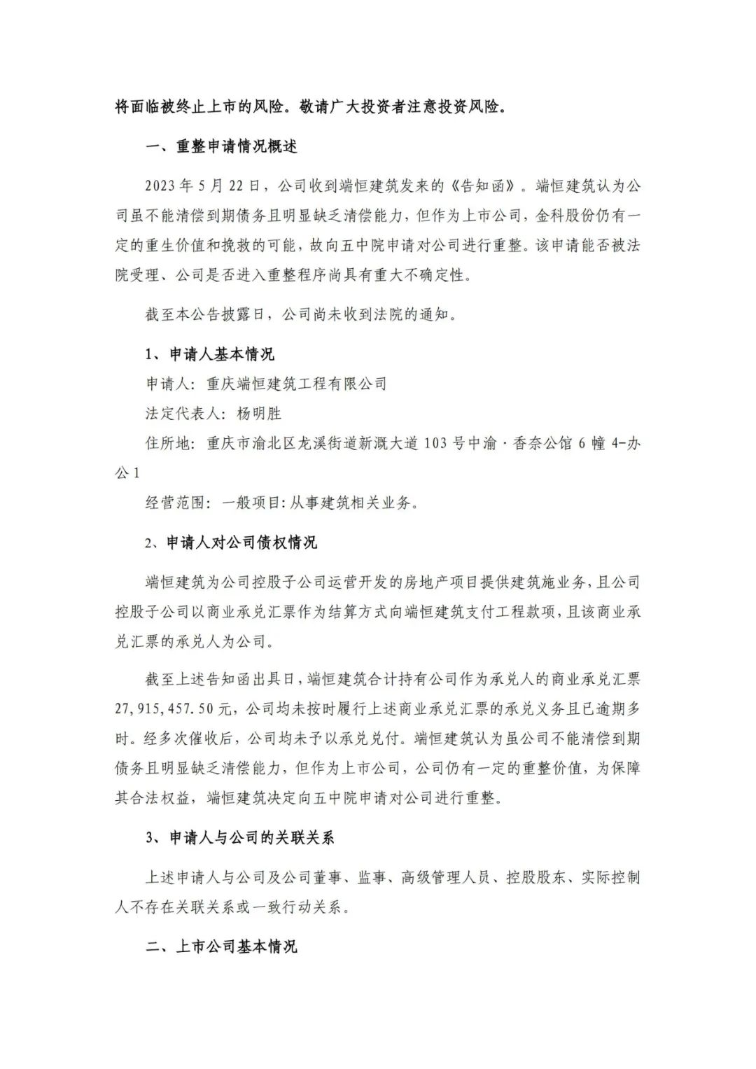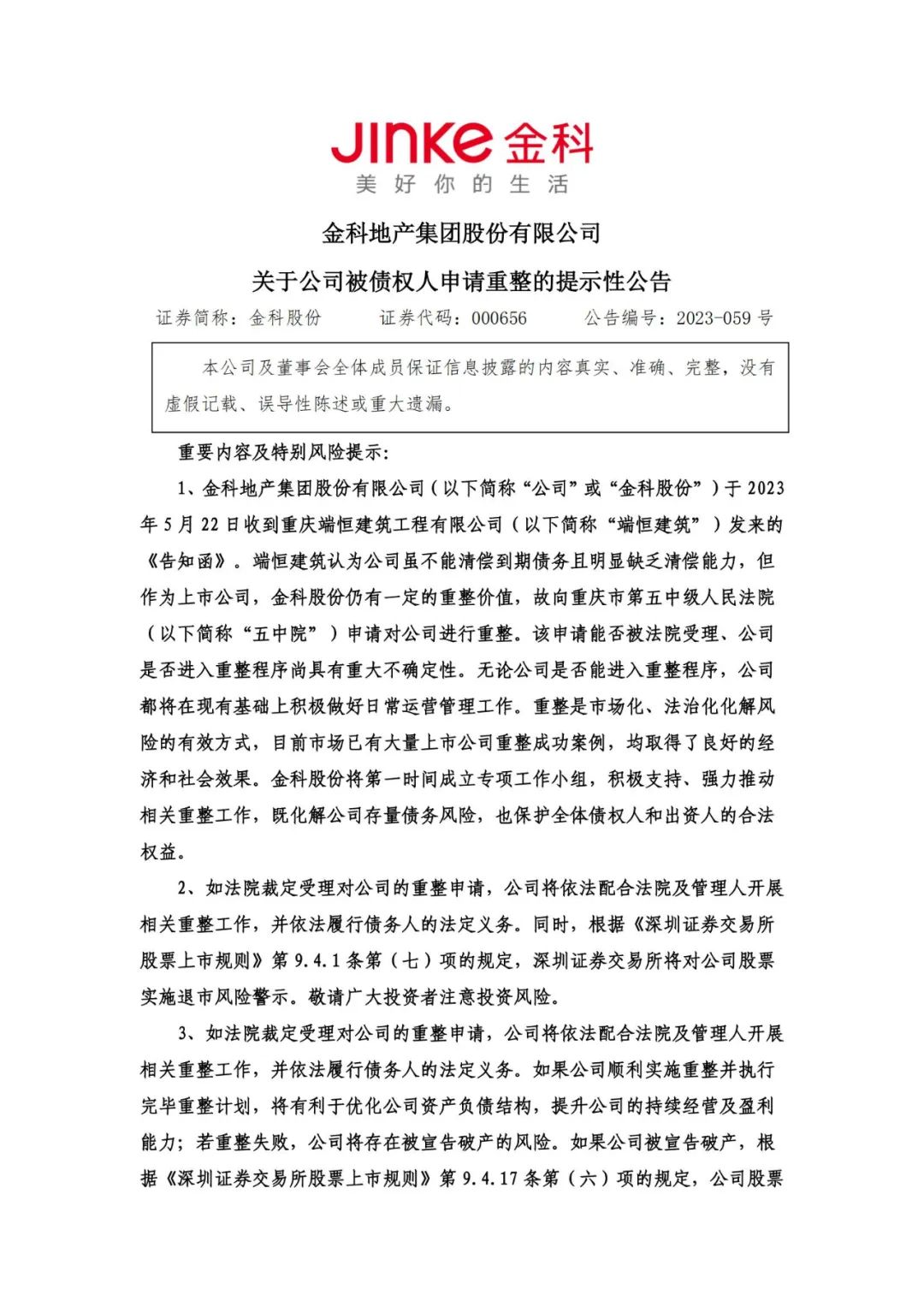 今天(5月23日),金科地产集团股份有限公司(简称“金科股份”,证券代码:000656)发布《关于公司被债权人申请重整的提示性公告》。 金科股份于2023年5月22日收到重庆端恒建筑工程有限公司发来的《告知函》。端恒建筑认为金科股份虽不能清偿到期债务且明显缺乏清偿能力,但作为上市公司,金科股份仍有一定的重整价值,故向重庆市第五中级人民法院申请对金科股份进行破产重整。 金科股份2022年度归属于上市公司股东的净利润为-21,392,041,770.47元(负214亿)。 金科股份作风险提示: (1)公司是否进入重整程序存在重大不确定性; (2)公司股票可能被实施退市风险警示; (3)公司股票可能面临终止上市风险。 《破产法实务》提示:破产包括破产清算、破产重整、破产和解三种类型。  |