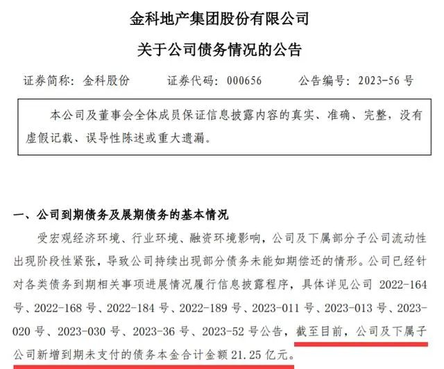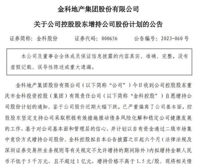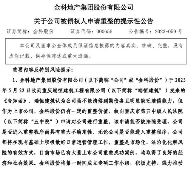 金科股份虽不能清偿到期债务且明显缺乏清偿能力,但作为上市公司,金科股份仍有一定的重生价值和挽救的可能,故向重庆市第五中级人民法院申请对公司进行重整。 5月22日晚间,金科股份(SZ000656,股价1.12元,市值59.8亿元)发布《关于公司被债权人申请重整的提示性公告》称,公司于2023年5月22日收到重庆端恒建筑工程有限公司(以下简称端恒建筑)发来的《告知函》,认为金科股份虽不能清偿到期债务且明显缺乏清偿能力,但作为上市公司,金科股份仍有一定的重生价值和挽救的可能,故向重庆市第五中级人民法院申请对公司进行重整。 公告显示,截至上述《告知函》出具日,端恒建筑合计持有金科股份作为承兑人的商业承兑汇票27,915,457.50元,金科股份均未按时履行上述商业承兑汇票的承兑义务且已逾期多时。经多次催收后,金科股份均未予以承兑兑付。 不过,金科股份也表示,该重整申请能否被法院受理、公司是否进入重整程序尚具有重大不确定性。 同日,金科股份还发布了多条公告,内容涉及股东大会决议、实控人增持等多项内容。 需要注意的是,金科股份股价已连续三日下跌,在公告发布当日,金科股份跌幅超9%,收盘价1.12元,距离触及1元面值退市岌岌可危。 来源:金科股份公告 或启动债务重整 金科股份在公告中表示,该申请能否被法院受理、公司是否进入重整程序尚具有重大不确定性。无论公司是否能进入重整程序,公司都将在现有基础上积极做好日常运营管理工作。 公告显示,重整不同于破产清算,是以挽救债务人企业、恢复公司持续盈利能力、保护债权人合法权益为目标的司法程序。重整是市场化、法治化化解风险的有效方式,目前市场已有大量上市公司重整成功案例,均取得了良好的经济和社会效果。金科股份将积极支持配合相关工作,各方相向而行,尽快推动,既化解公司存量债务风险,也保护全体债权人和出资人的合法权益。 在业内人士看来,重整的底层逻辑仍然是重生价值,是债权人与债务人对未来发展价值预期的正向叠加,目前已经成为上市企业摆脱经营困境、实现正常化经营的重要路径。如果金科股份顺利实施重整并执行完毕重整计划,将有利于优化自身资产负债结构,提升企业的持续经营及盈利能力,产生多重正向效果。 在此之前,*ST中天也因债务问题被债权人平安银行惠州分行提请重整。 实际上,自2022年5月公司爆发债务危机以来,金科股份已通过多种途径推进存量债务展期,累计完成约316亿元有息负债的期限调整工作,其中包括公开市场债务12笔,涉及本金约118亿元。同时,金科股份已累计获批国家及地方政府专项借款资金额度超35亿元,其中超25亿元可用资金已拨付至项目公司。 来源:金科股份公告 不过,根据5月19日金科股份发布的公告来看,截至公告当日,金科股份及下属子公司新增到期未支付的债务本金合计金额 21.25亿元。 控股股东增持 在5月22日晚间,金科股份还同步发布了《关于公司控股股东增持公司股份计划的公告》。 根据公告,控股股东金科控股或其指定的主体计划自公告披露之日起6个月内,拟以不高于1.5元/股的价格,以其自有资金以集中竞价交易或大宗交易方式择机增持公司股份,增持股份金额不低于5000万元且不超过1亿元。 而在本次增持计划实施前,金科控股持有公司股份24,286.09万股,占金科控股总股本的4.55%。 来源:金科股份公告 对此,金科股份表示,鉴于公司股价近期大幅下跌,已严重偏离了公司基本面。控股股东选择此时增持公司股份,是基于对公司未来发展前景的信心以及对公司长期价值的认可,也是为了促进公司持续、稳定、健康发展,维护公司股东利益,提升投资者信心。 据悉,在公告发布当日,金科股份跌幅超9%,而在此前两个交易日公司股价也曾连续下跌。截至公告当日,金科股份股价报收1.12元/股,距离触及1元面值退市岌岌可危。 金科股份近期股价表现 来源:同花顺 另据《每日经济新闻》记者了解,在5月22日举行的股东大会上,金科股份实控人黄红云直言,“金科是我一手创立的企业,我将不遗余力协调各类资源来帮助公司发展,支持公司尽快走出困境,全力维护公司全体股东的利益。不管是引进国有企业战略投资人还是债务重组重整,任何有利于公司化解流动性困境、回归平稳健康发展的工作我都会全力支持。” 黄红云的这一“决心”,在此次增持计划中也有所体现。根据公告,此次增持不基于增持主体的特定身份,若控股股东丧失特定身份时也将继续实施本次增持计划。而在计划实施期间,如遇公司股票停牌,增持计划将在股票复牌后顺延实施。 此外,在保交付方面,2023年一季度,金科股份累计完成43个项目、48个批次交付,交付总面积约276万平方米,涉及18126户业主。 欢迎关注资产界,更多干货文章,助您搞定资金、搞定资产、搞定运营。 |