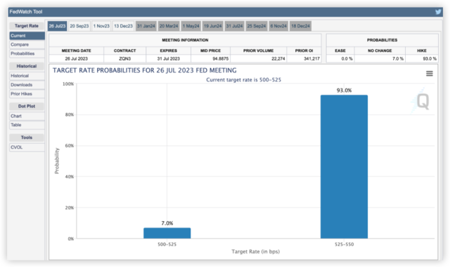 本周五,爆冷的非农数据并未浇灭投资者对加息的恐慌,超出预期的工资涨幅让许多投资者定价美联储7月加息基本板上钉钉。美债在数据发布后迅速走低,十年期和三十年期美债收益率升至今年以来最高位。 与此同时,代表实际利率的通胀保值债券的收益率正在飙升。经通胀调整的10年期基准美债(简称TIPS)名义收益率周五升至1.82%,为2009年以来的最高水平。 实际利率通常代表实体经济的真实投资收益及企业的真实融资成本,对微观主体行为、金融资源配置及资产定价有重要影响,受到政策制定者及市场参与者的广泛关注。 超低风险国债实际收益攀升,将会降低其他资产的吸引力,同时借贷成本提升也会给企业部门带来负面影响。 富达国际全球宏观和战略资产配置主管Salman Ahmed对金融时报表示, 实际利率上升意味着企业曾经以前能以0或接近0的实际利率举债,而如今则需要付出高得多的代价。他举例称,2021年期间,一个典型的高收益公司能够以大约4%的利率筹集资金,现在将不得不支付超过12%的利率。 富达国际数据显示,今年迄今,美国银行业发放的新贷款折合成年率为2790亿美元,低于2015年至2019年期间4810亿美元的平均水平。 融资标准也正在收紧,股票估值进一步承压 对于股市而言,从理论上讲五年前,5% 到 7% 的股票回报率应该不错,但现在不行了,为了保持同样的差距,击败 Tips 的回报要高得多,股票回报率应该达到 10% 或 15%。因此股价应该会下跌。 这一逻辑是周三美联储会议纪要后实际收益率大幅上升引发股市抛售的原因之一。尽管如此,股市今年仍然大幅上涨,这主要是由于对人工智能可能性的兴奋促使投资者涌入少数大型科技公司。 但繁荣的股市和悲观的债券投资者不可能都正确,实际收益率保持在高位,终将损害股市。 在实际利率飙升的背景下,如果美联储继续加息,也会大大增加硬着陆的风险。目前,市场已充分定价7月加息。芝商所美联储观察工具显示,基金市场目前认定7月加息概率为93%。 不过,许多分析师指出,目前的估值仍然相当高,是基于投资者在定价明年实际利率会大幅回落。 |