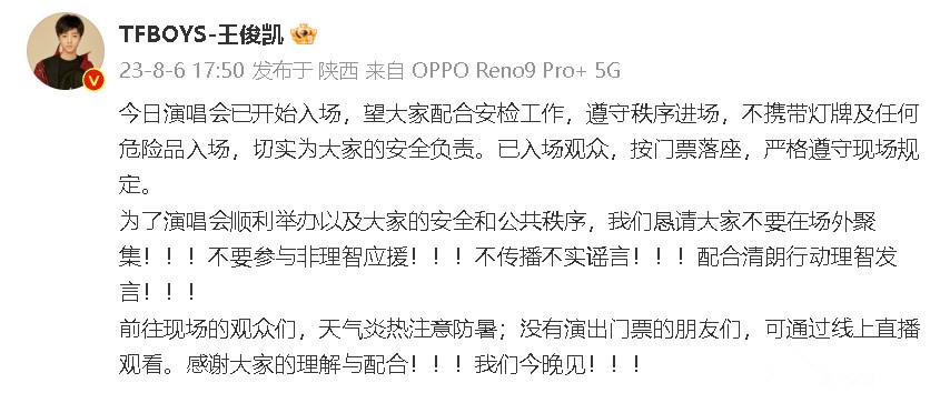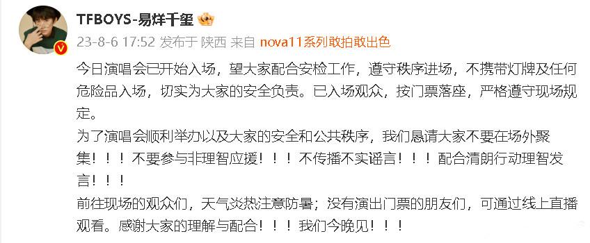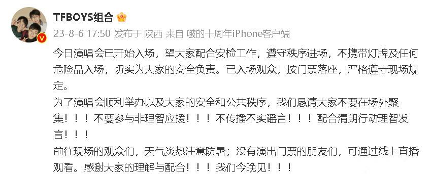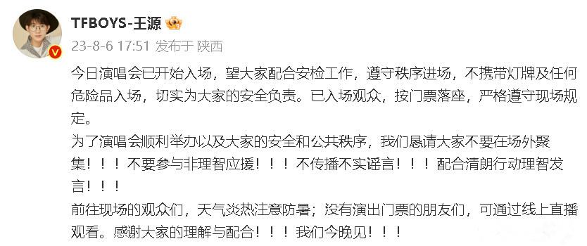 刚刚,组合官博及@TFBOYS-王俊凯 @TFBOYS-王源 @TFBOYS-易烊千玺 发文呼吁大家配合安检工作,遵守秩序进场,不携带灯牌及任何危险品入场,遵守现场规定;恳请大家不要在场外聚集,不要参与非理智应援,不传播不实谣言。