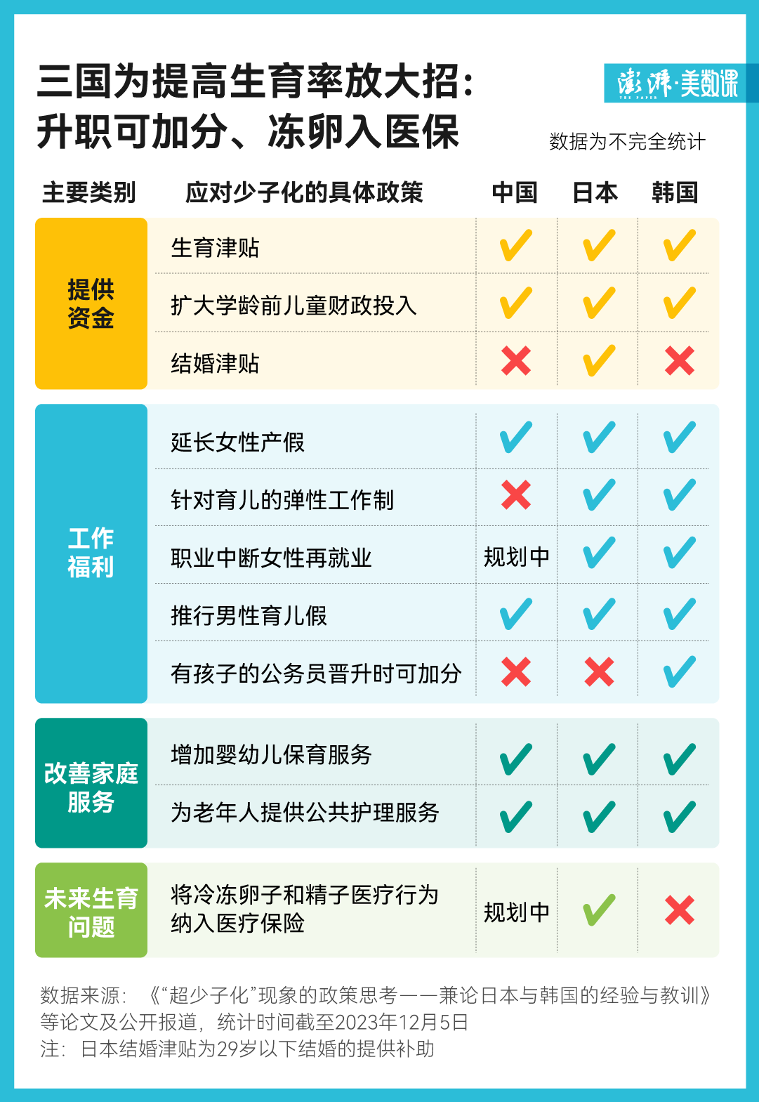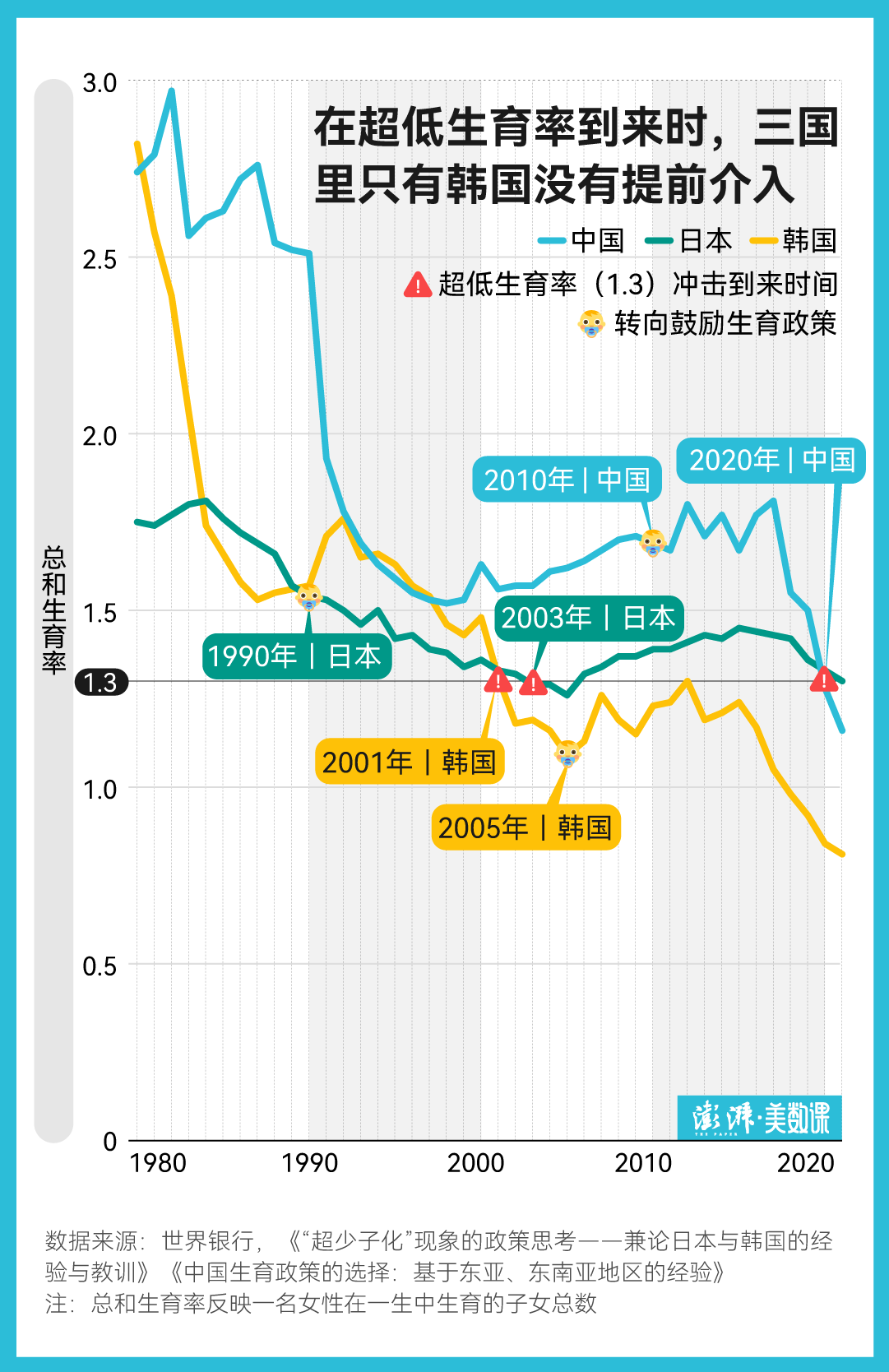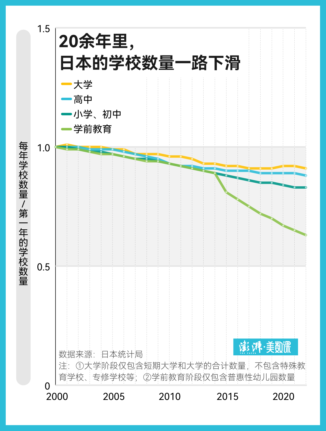 近日,据韩国统计厅数据,2024年韩国小学新生人数预计将首次跌破40万,创有相关记录以来的最低值。 除了入学人数减少之外,今年热搜上还有不少词条都与韩国生育相关:“韩国公务员想升职得先生娃”“韩国猫狗数量超小孩”。这些都指向了韩国生育率的下滑——2023年第三季度,韩国的总和生育率(即育龄期妇女在一生中平均生育的孩子数量)已经跌至0.7,创全球新低。如果维持这一生育率到本世纪 60 年代末,韩国的人口将从现在的近 5200 万锐减到 3500 万以下。 人口危机并不是韩国独有的问题,澎湃美数课梳理了中日韩20余年来的相关数据、采访了多名专家,试图从日韩的历史变化与政策影响,看到中国可能遇到的人口挑战。 20余年来,日韩的入学人数一路下滑 位于韩国首尔市东北部的道峰高中,今年仅仅招到了45名新生,它将成为韩国第一所因缺少生源而关闭的普通公立高中。在日本香川县小手岛中学,全校唯一的学生今中章乃在今年4月毕业,这所中学也迎来了关停的一刻。这些并非个例。 数据显示,20余年来,日韩两国在幼儿园、小学、中学、大学等阶段的入学人数几乎都在一路下滑,而中国的幼儿园新生从2015年开始呈现波动下降的趋势,像是高中、大学的新生数量则暂时还没有受到影响。 《人物》的一篇报道就提到,曾经学位紧缺的成都市高新区,有15所公办幼儿园发布春季学期空余学位招生公告,空余学位300余个。而在过去,公办幼儿园基本没有招生困难的问题,部分学校甚至对入园新生所在家庭的户籍、房产等方面有要求。 对中国来说,当前的招生难只是一个开端,这些影响将产生连锁反应,未来中国的其他教育阶段都可能面临招生难题。 中国社会科学院战略研究院院长张翼在一篇发表于2022年的文章中写道,过去十年,中国主要经历了小学学生生源数量占比减少的过程,也经历了小学学校数量日趋减少的过程。但未来十年,即2020年至2030年,将会经历由于初中和高中教育阶段学龄人口占比下降,导致初级中学和普通高级中学数量减少的过程。在青年人口转型过程中,大学专科和大学本科的招生生源也将受到一定程度的影响。 人口危机的多米诺骨牌,在日本最先倒下 中日韩三国中,日本最早面临生育率快速下滑的难题,其影响也已从日本的幼儿园一路冲击到了大学。 据《日本经济新闻》在今年6月的报道,当前日本少子化正在以超出教育界预想的速度发展,或将导致超200所大学因缺少生源而倒闭。不过,日本统计局数据显示,少子化率先冲击到的其实是短期大学(相当于中国专科),而普通大学的数量和入学人数实际上略有增加。 本质上,少子化影响到的更多是质量较差的大学。相比2000年,日本短期大学在2022年里少了263所,入学人数少了近10万人。今年春天以来,惠泉女子学院大学、神户海星女子学院大学、上智大学和龙谷大学的短期大学部都公开宣布停止招生。 需要指出的是,学校数量的减少与政策法规、新时代需求、学校发展不均衡等因素都有关,不能简单说跟生育率下降直接挂钩。 中国的中小学数量自2001年起就开始减少,这背后与城镇化中农村适龄儿童生源减少有关。另外,中国教育科学研究院研究员储朝晖告诉澎湃新闻,导致学校数量减少的原因还可能是学校之间的发展不均衡,出现大班制、超规模的学校,“学校规模大,学校数量就少了”,这会影响到学校的管理有效性、对学生的关注度。 而新增人口减少所会影响的,也不仅仅是学校。韩国的中央银行韩国银行在本月 3 日发布报告说,如果韩国生育率继续低迷,2050年的韩国经济将会负增长。 生育大礼包越来越多,但效果如何? 为了应对少子化现象,各国出台过多项鼓励生育的政策。最近,韩国就放出催生“大招”:从明年1月起,最基层两级的公务员,如果生2个或以上的孩子,就能在晋升评比时获得额外积分。 更早遭遇生育难题的日本,尝试过的方法也更多——不仅有结婚津贴,还将冷冻卵子和精子医疗行为都纳入医疗保险。此外,日本在今年推出了大力度的“异次元少子化政策”,主要措施包括三大方面:扩充儿童补贴,增强学童保育、病童保育和产后护理,推进劳动方式改革。 不过,这些政策目前看起来似乎不太有效,韩国、日本的总和生育率还在下滑中。2006年,牛津大学人口学教授大卫·科尔曼(David Coleman)就曾预测,由于生育率持续下跌,韩国可能会成为地球上第一个自然消失的国家。 储朝晖说,检验力度是否足够,关键是看人口是否还在下降、出生率是否还在下降。日本女子大学社会福利学系教授沈洁也持有类似态度,她认为当前中国生育津贴和产假是远远不够的,还需要付出大量的社会支出,增加更多符合需求的公共幼儿设施。 一篇发表在《英国医学杂志》的论文分析了2014年至2018年间韩国250个地方政府的生育促进政策。结果显示,这些政策基本上对生育率没有积极影响,但这个结论不能解读为韩国的生育政策是失败的,因为即使政策效果是积极的,也可能被其他因素抵消。 除了鼓励生育政策的力度,政策的介入时间对生育率也有影响。沈洁认为,相比超低生育率到来的时间,韩国政策的介入要比日本的晚,导致韩国的少子化要比日本的严重,而中国政策的介入时间在日本和韩国之间。 沈洁认为,应对少子化的社会政策目标不能只局限在提高总生育率,而是应该把它放在社会结构、社会文化变迁